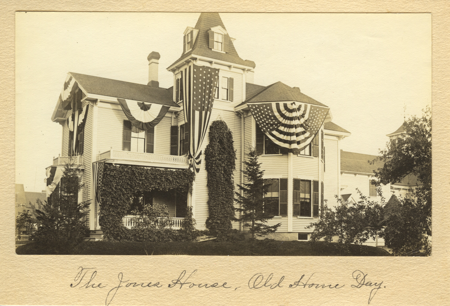 Mrs. Martha Jones House on South Main St., built 1885, purchased by Brewster Free Academy in 1992, now known as Goodwin House. Decorated for Old Home Days, c. early 1900's.