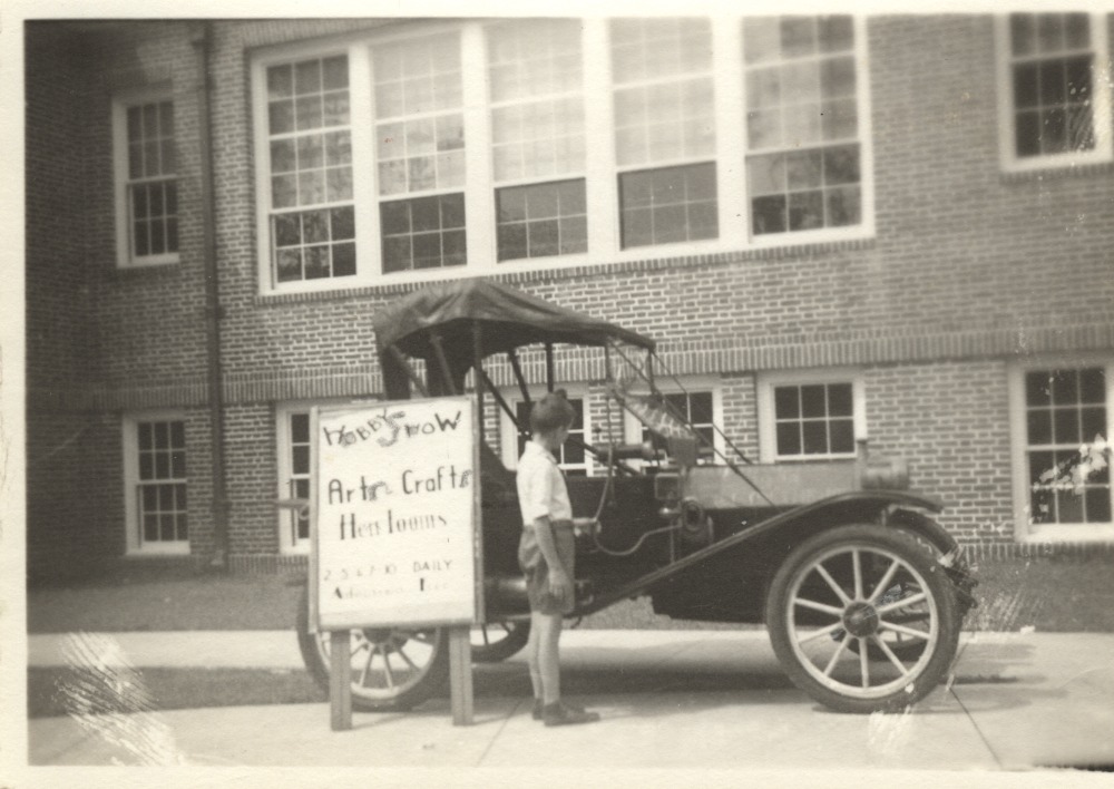 Horseless carriage by sign for an Arts and Crafts Show in front of Carpenter School. Likely c. mid-1920's.