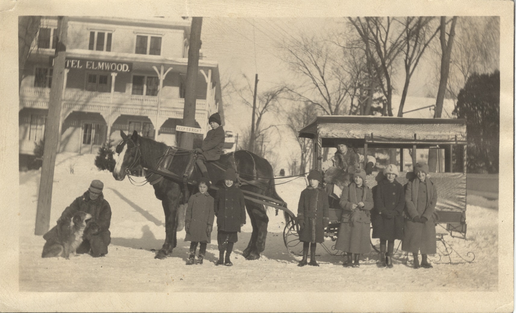 School Team (bus), c. 1915, in front of Hotel Elmwood, now the site of the Wolfeboro Post Office. Kneeling in front is driver Alvan T. Hatch with dog "Chief", who went on every trip. This route was from Carpenter School up North Main Street. Anyone living above Forest Road got a free ride. Those who lived closer had to pay for the ride, presumably because they were close enough to be able to walk to school.