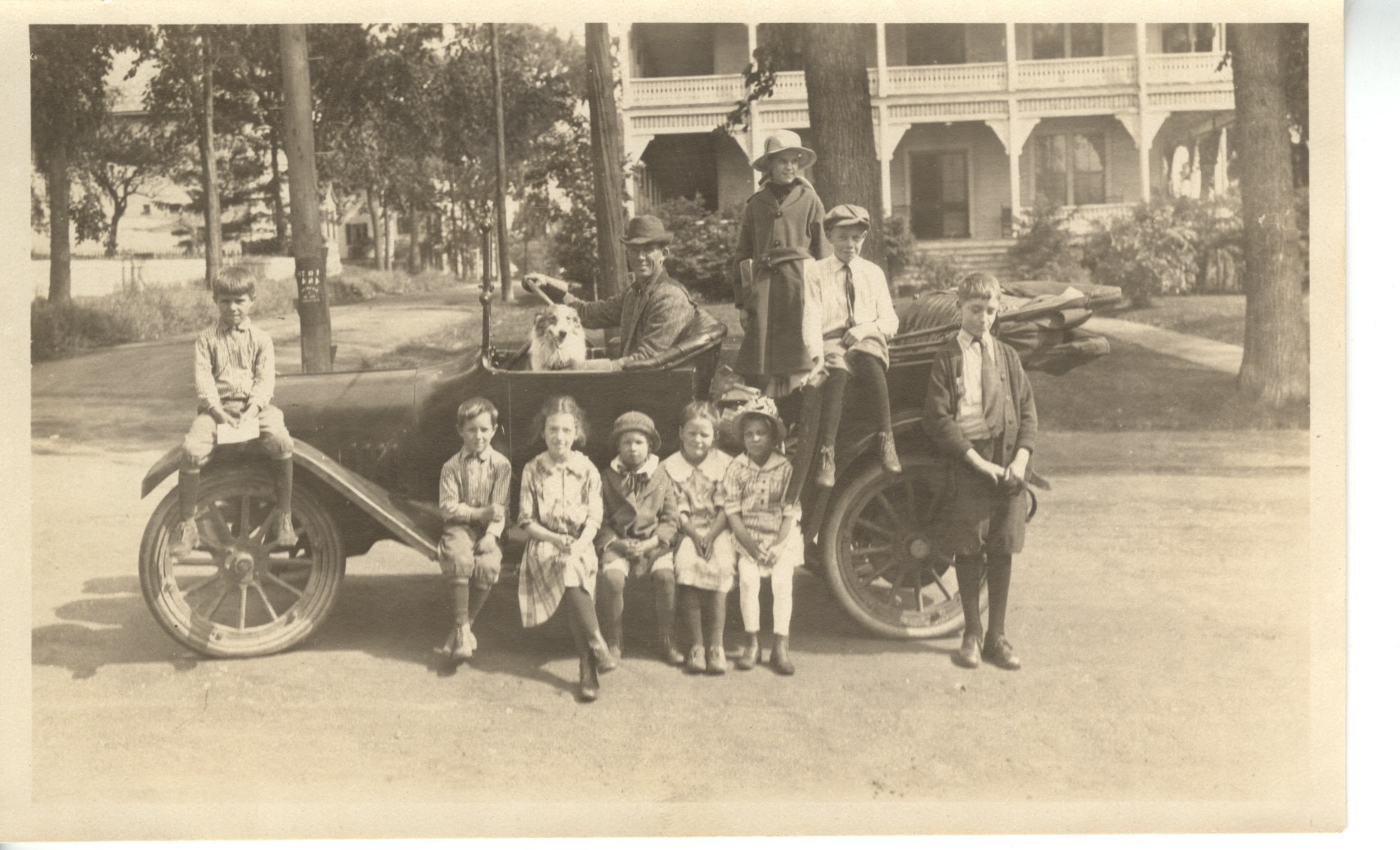 Early powered school bus in front of Hotel Elmwood (now site of Post Office). Driver is Alvan T. Hatch. Children are, L to R, Loren Piper (on mudguard), Bernice Osgood & Webster Goodwin (on tonneau), and Ivan Piper, Dorothy Mather, Junior? Goodwin, Unknown, Unknown, and Robert Meader.