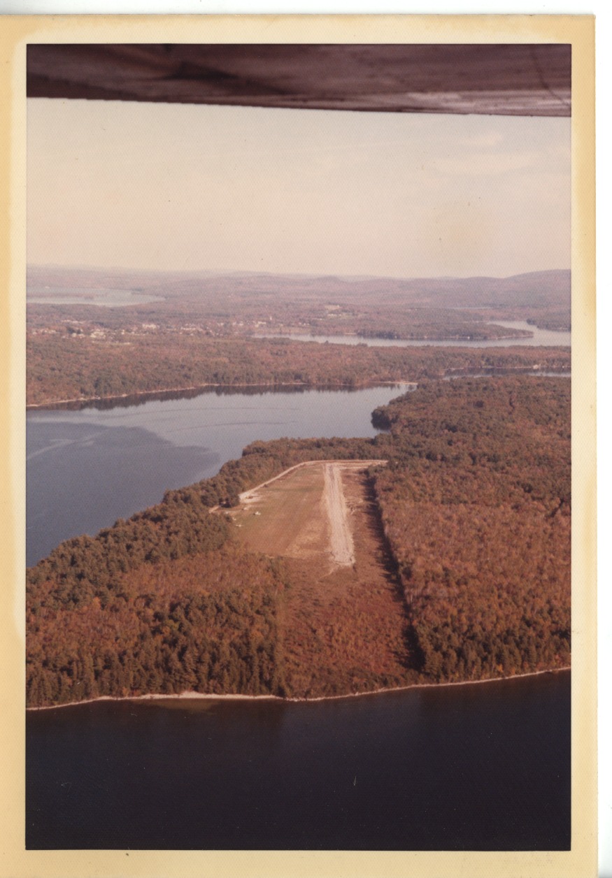 Lakes Region Airpark runway. Foreground is Wolfeboro Bay. Background is Winter Harbor.