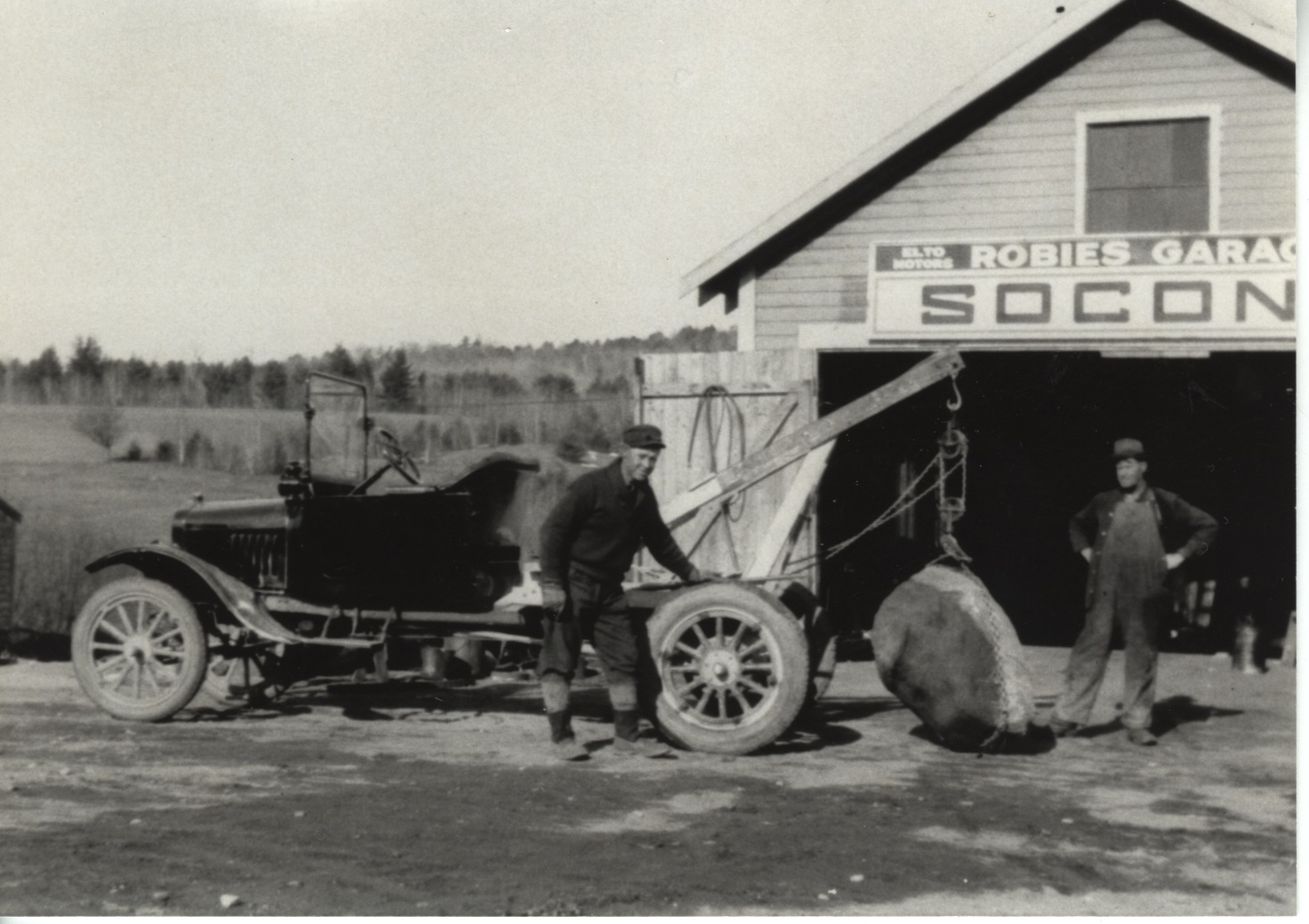 Elbridge and Walter Robie, L-R, at their garage at the junction of Center St. and Gov. Wentworth Hwy. Car has been modified to be a tow truck.