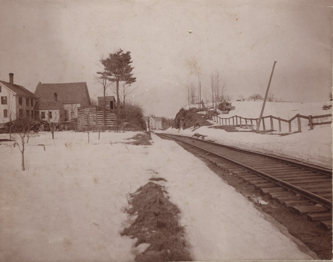 Tracks thru the cut in Wolfeboro Falls, heading away from Wolfeboro. The houses on the left are on the shore of Crescent Lake.
