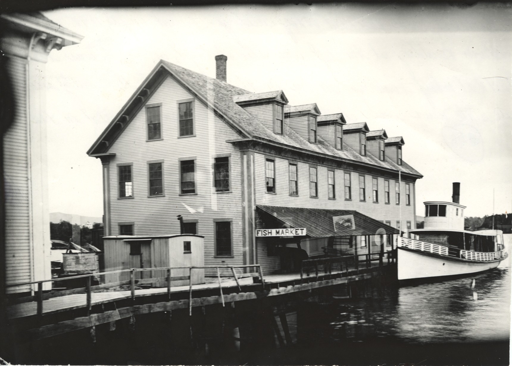 Boston and Maine Railroad wharf building built in the early 1870's. Photo is c. mid-1890's. The first floor was used for freight storage and, at various times, the fish market (shown), a pool hall and a saloon. The second floor was known as Dartmouth Hall, used as a roller skating rink, dance hall, and a general gathering spot for events, including political rallies. The building burned down in 1899 in the Goodwin Block fire. The back of the Goodwin Block is on the left. The view is from the downtown bridge over the outlet of Back Bay, once known as Front Bay.