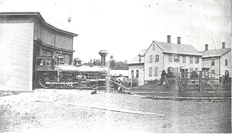 Boston and Maine locomotive "Ossipee" poses in front of the Wolfeboro enginehouse. Even the roundhouse dog gets into the action. The enginehouse was located between the Freight building and Back Bay, about where a condominium now exists. The roundhouse turntable was used to assign engines to specific repair bays in the roundhouse. The building burned on Oct. 3, 1931.