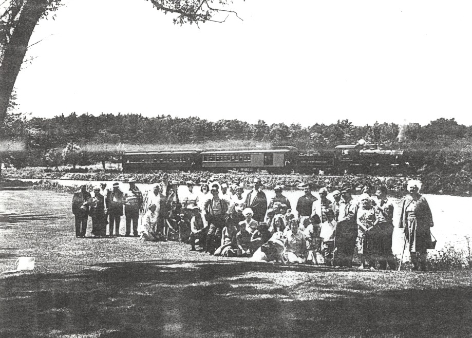 During the 1970's and 1980's, the Wolfeboro Railroad played host to many special groups. This group from the New Hampshire Association for the Blind is on the shore posing after having had lunch at Edward's Resort. Behind them, across the Smith River, the train on the Crescent Lake causeway waits to take the group to Sanbornville.