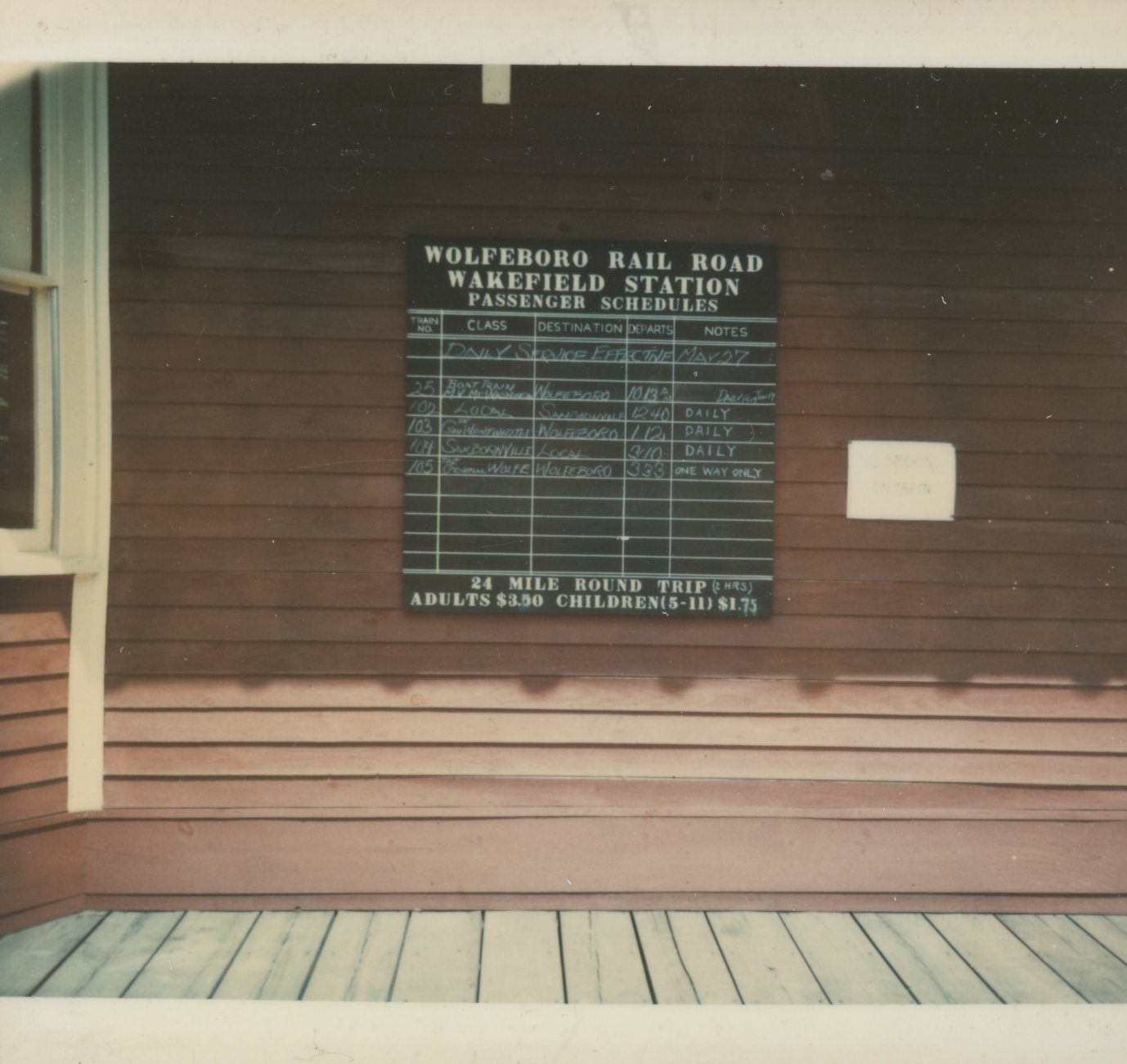 Photo from the 1970's when the Wolfeboro Railroad was a tourist attraction. Signboard on the Wakefield Station. The station was located at the Route 16 crossing.
