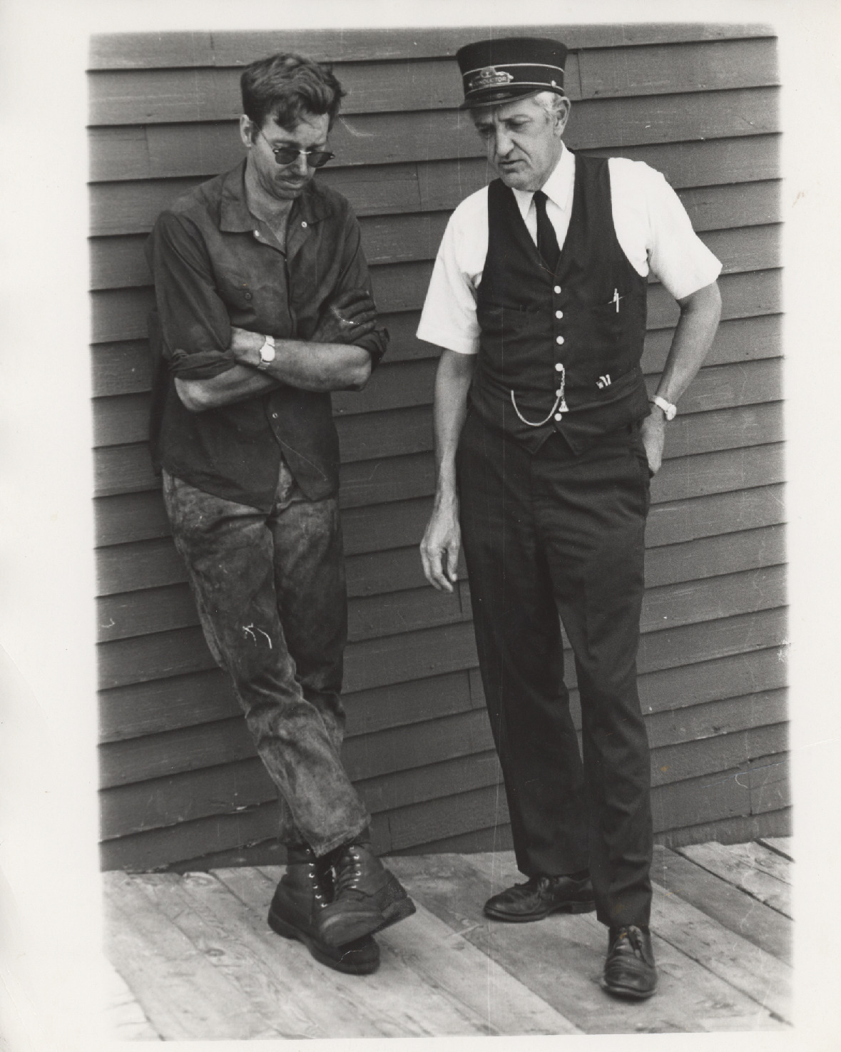 The Boston & Maine Railroad ran occasionally in the 1960's, then ran as a tourist train in the 1970's after sold by the Boston & Maine RR to the Wolfeboro Railroad Company. Standing in front of the station are Jim Moore, left, and Don Hallock, right. Don Hallock was an Engineer and Railroader, and the owner of the Wolfeboro Railroad Co. from 1972 to 1980. In the 1970's, he designed the Public Safety Building and helped restore the Wolfeboro Railroad Station. In the 1980's, he restored the Town's original fire equipment and was the prime mover in adding the Firehouse to the Clark Museum Complex.