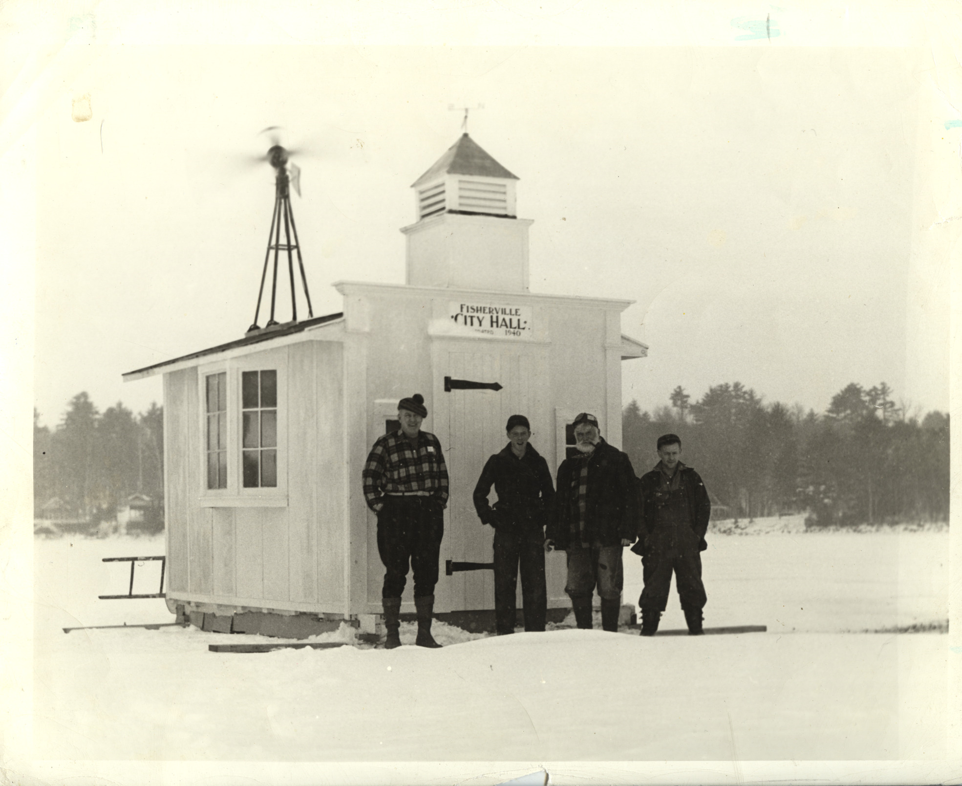 "Fisherville" on Wolfeboro Bay, c. 1940. L-R, Ralph G. Carpenter, Sr., Charles Glidden, "Mayor" Harry Parkins and Warren Smith. The "City Hall" was always located among a cluster of bobhouses.