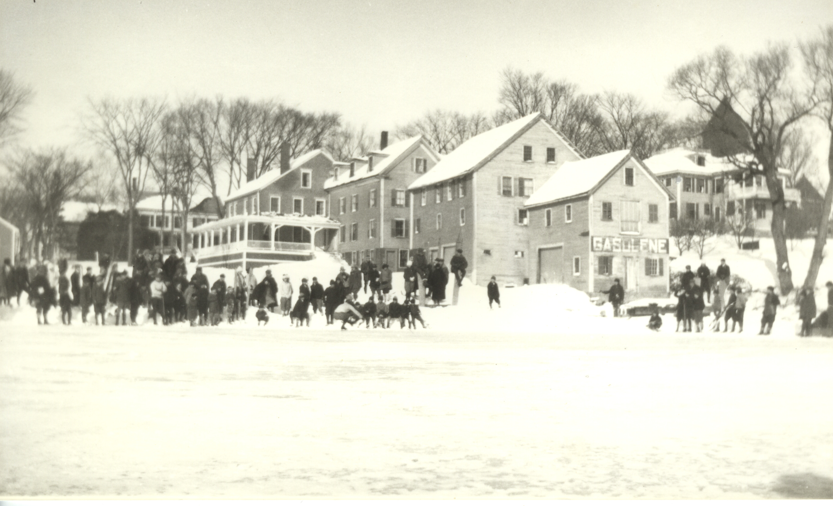 Crowds gathered on the shore to watch some activity on the ice, possibly a hockey game. The group of attached buildings is the Ann Inn, now the site of Town Park and Cate Park. C. 1928.