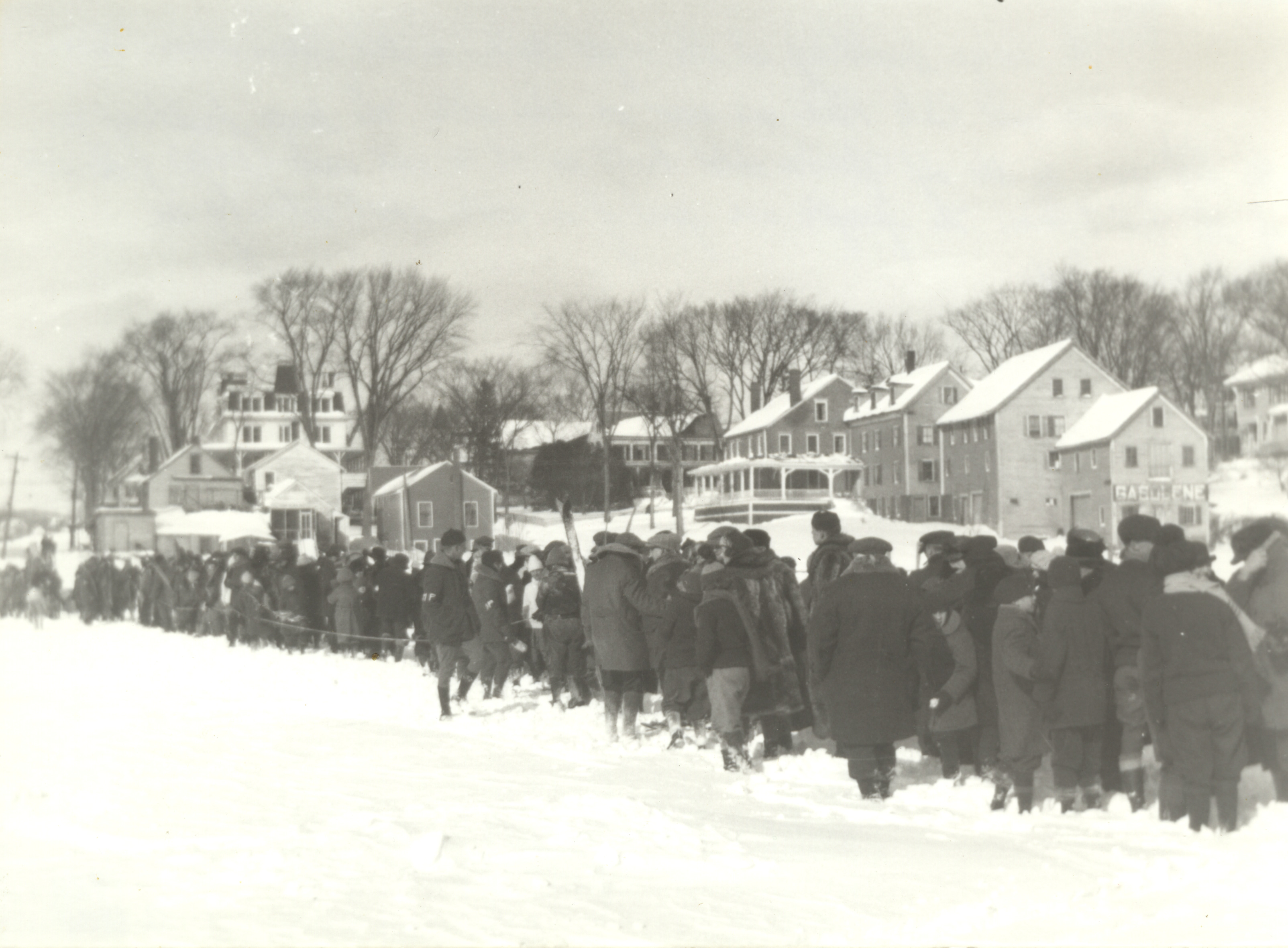 Crowds gathered on the shore to watch some activity on the ice, possibly a hockey game. The group of attached buildings is the Ann Inn, now the site of Town Park and Cate Park. The large building in the left background is the Glendon Hotel, now the site of the Post Office. C. 1928.