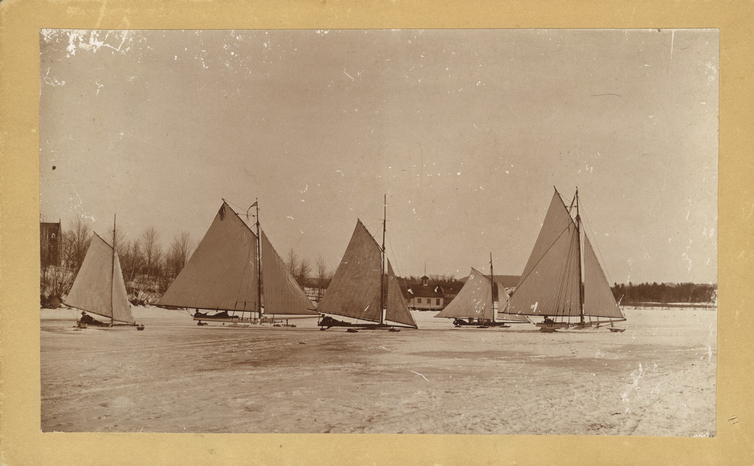 Ice boats on Lake Winnipesaukee, c. 1900. Pavilion Hotel Boathouse in center background; Brewster Free Academy on far left.