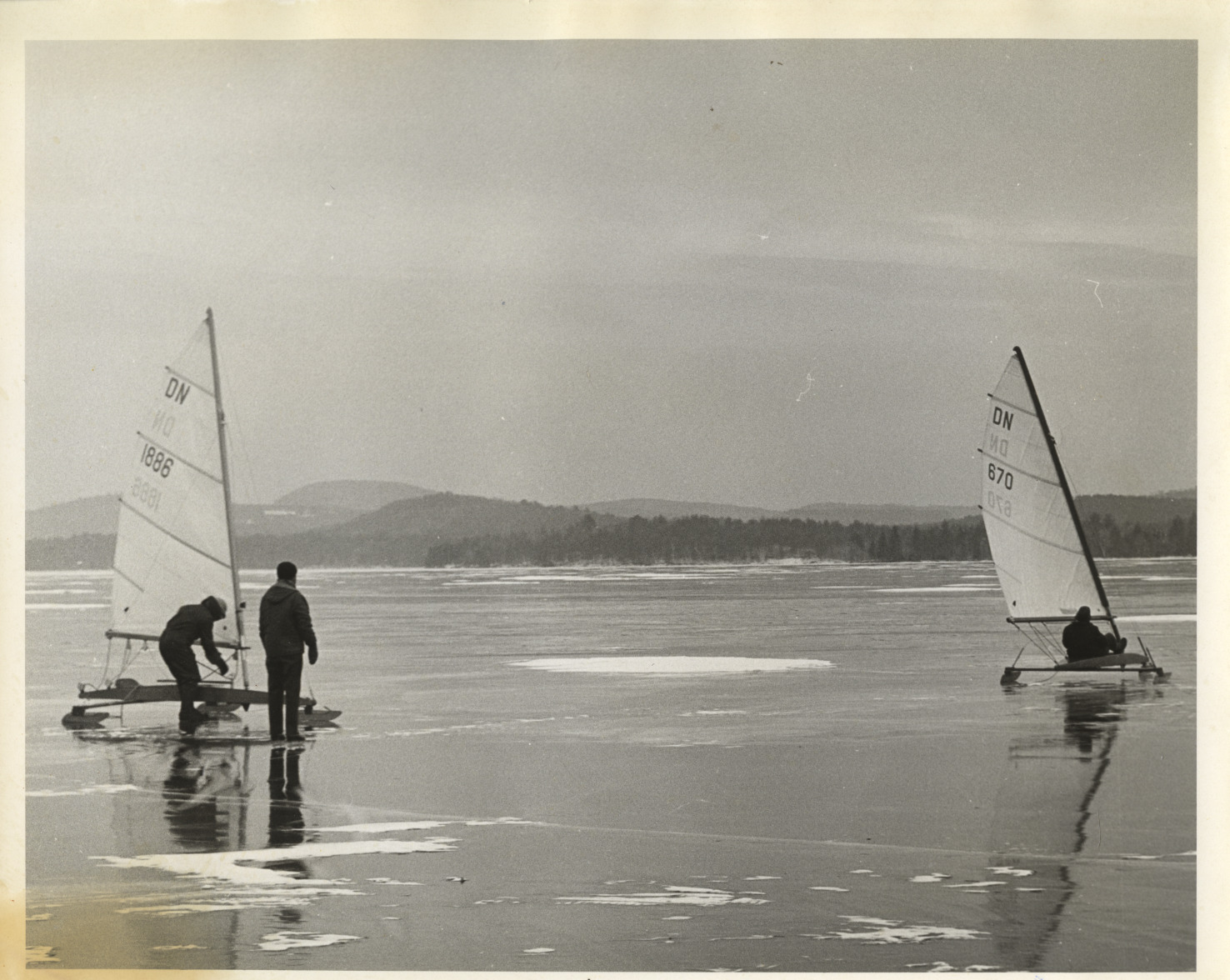 Ice boats starting up, 1971. Looks like Albee beach on Lake Wentworth, looking at Stamp Act Island.