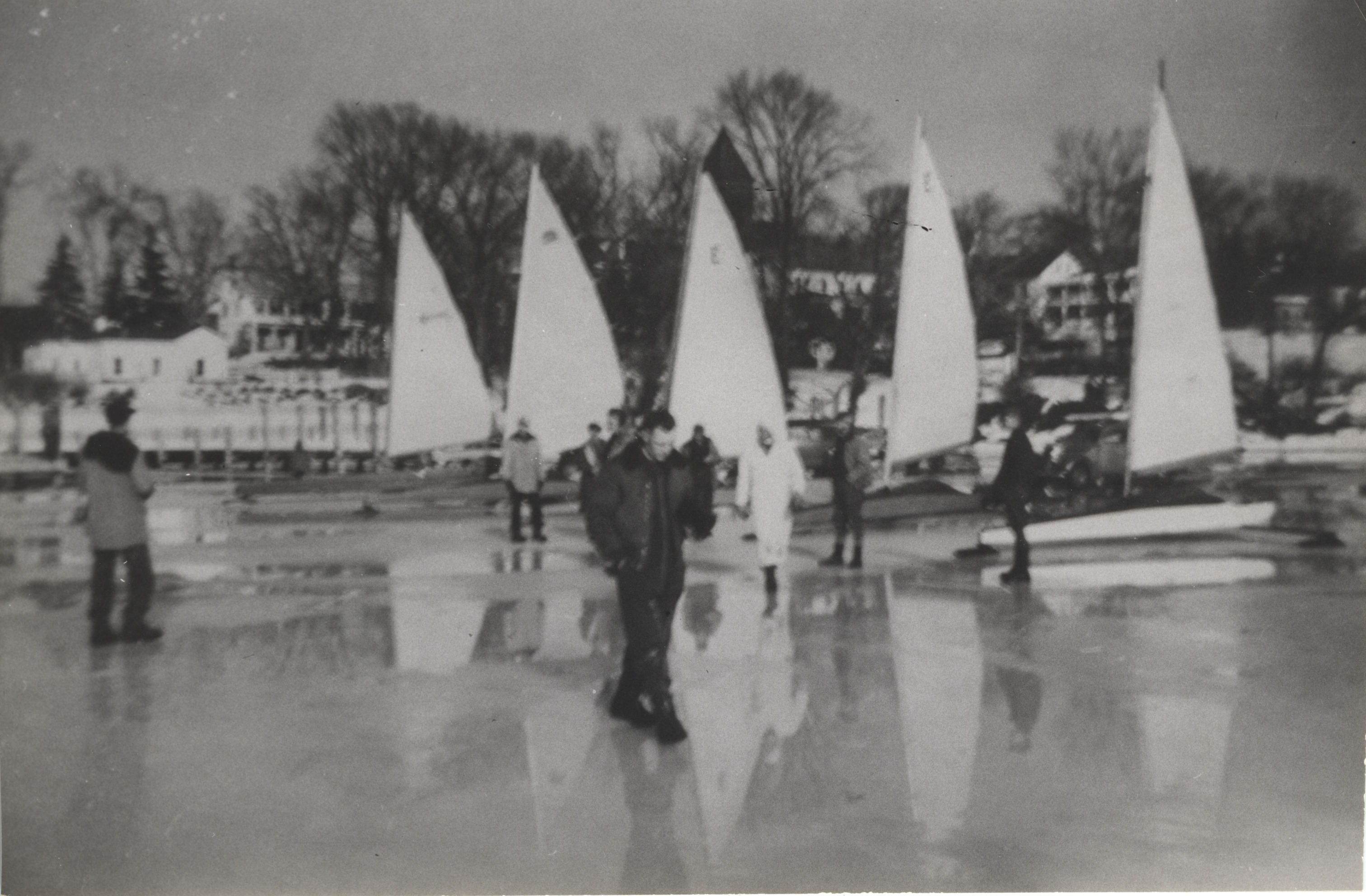 Ice boats preparing to sail. Looks like a competition or an organized outing.