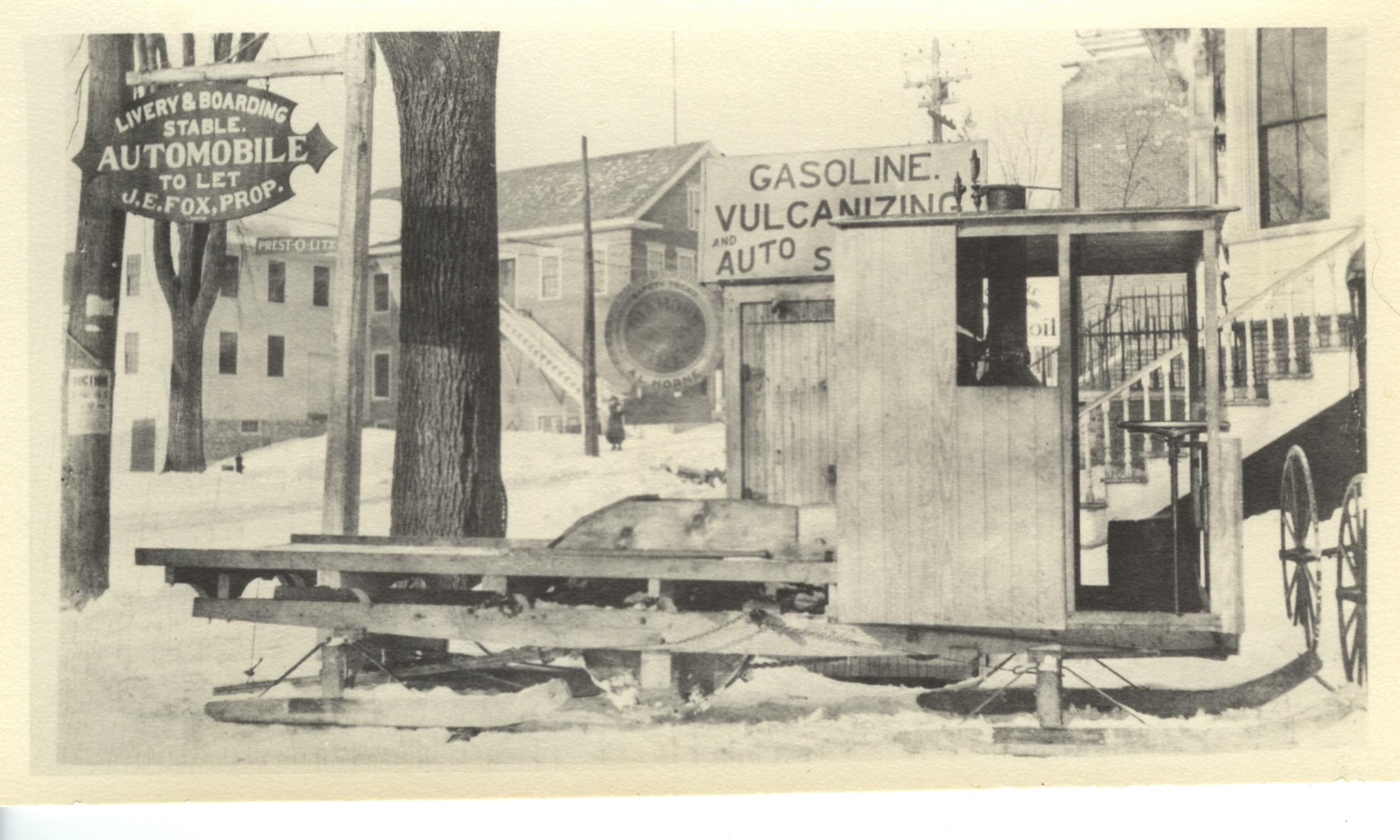 Motorized bob house is gassing up at the corner of North Main St. & Lake Ave. This home-made machine is driven by the toothed wheel in the center behind the house structure. On the right is the Durgin Block, across the street. C. 1890's.