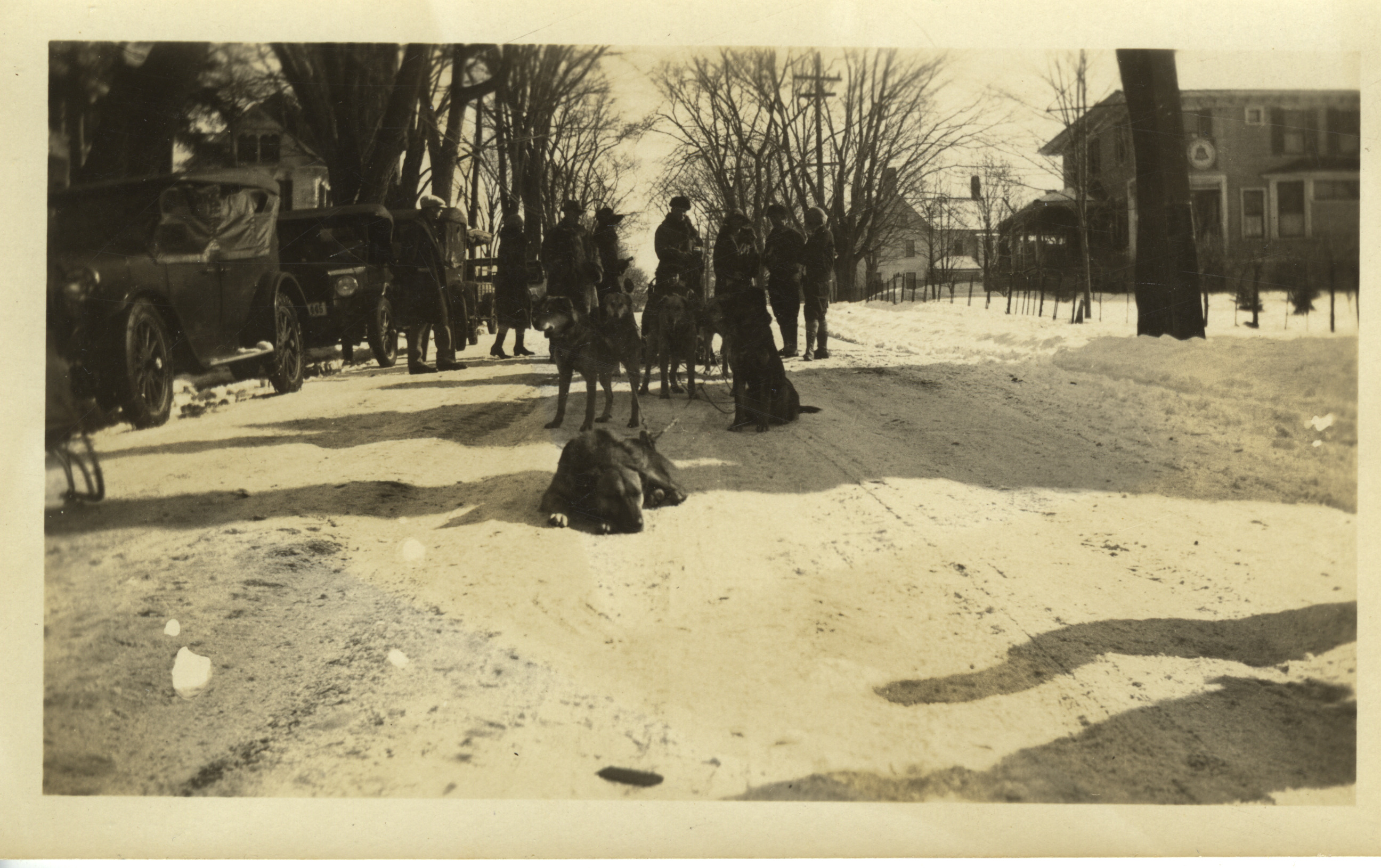 Dog Sled racing, Winter Carnivals, c. late 1920's. Lead dog taking a rest.