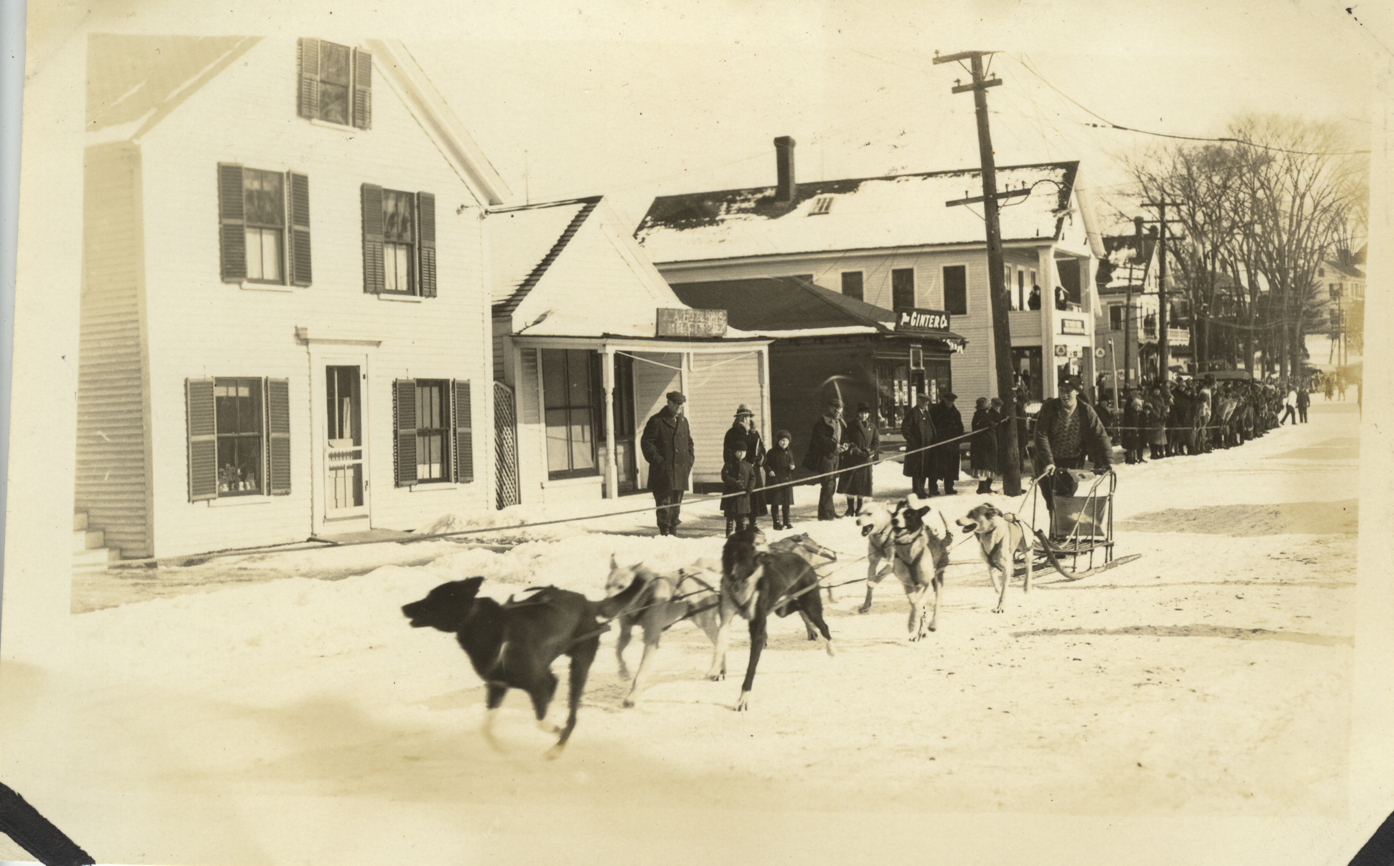 Dog Sled racing, Winter Carnivals, c. late 1920's. Running up North Main Street, toward the finish line?