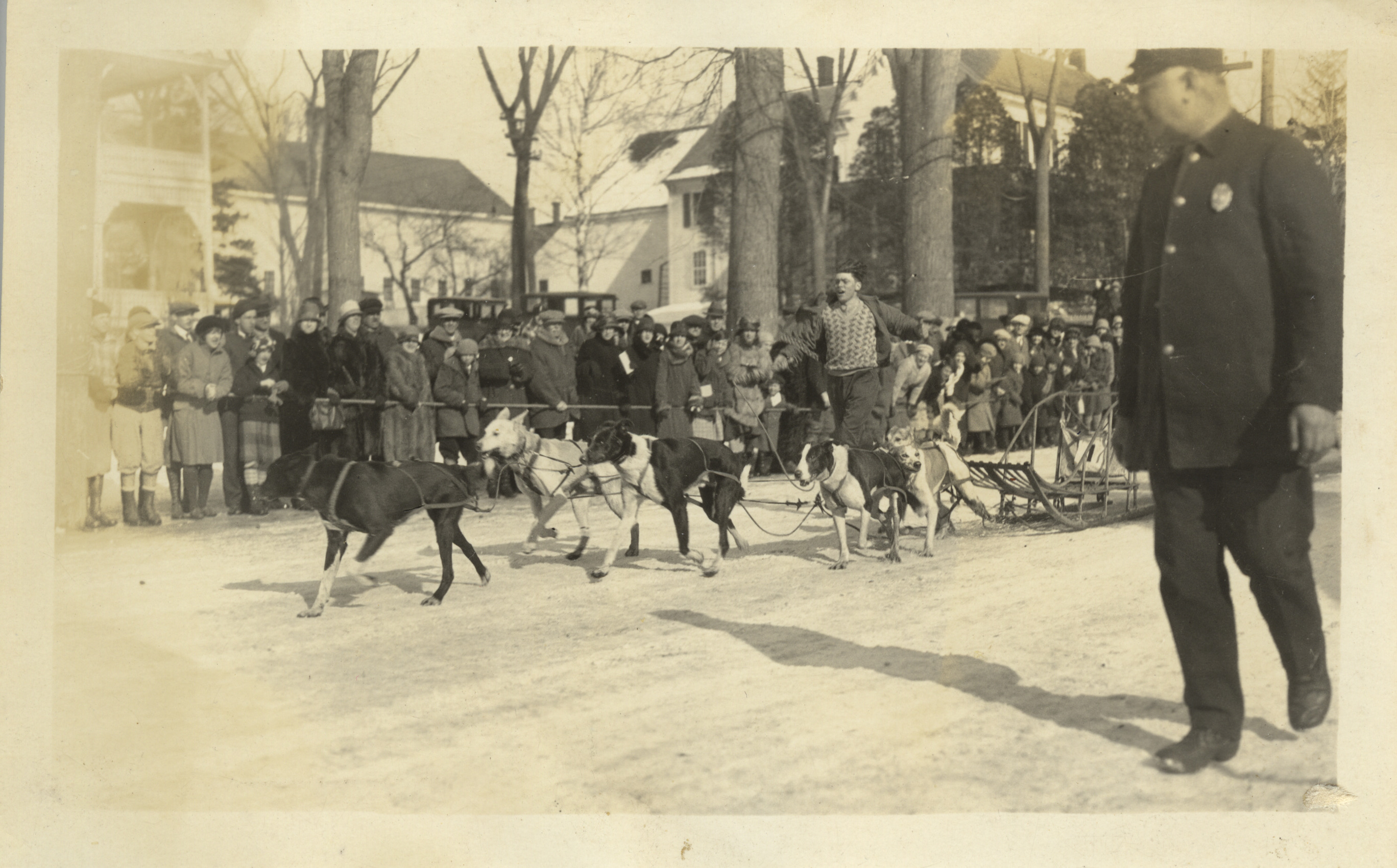 Dog Sled racing, Winter Carnivals, c. late 1920's. Race in progress.