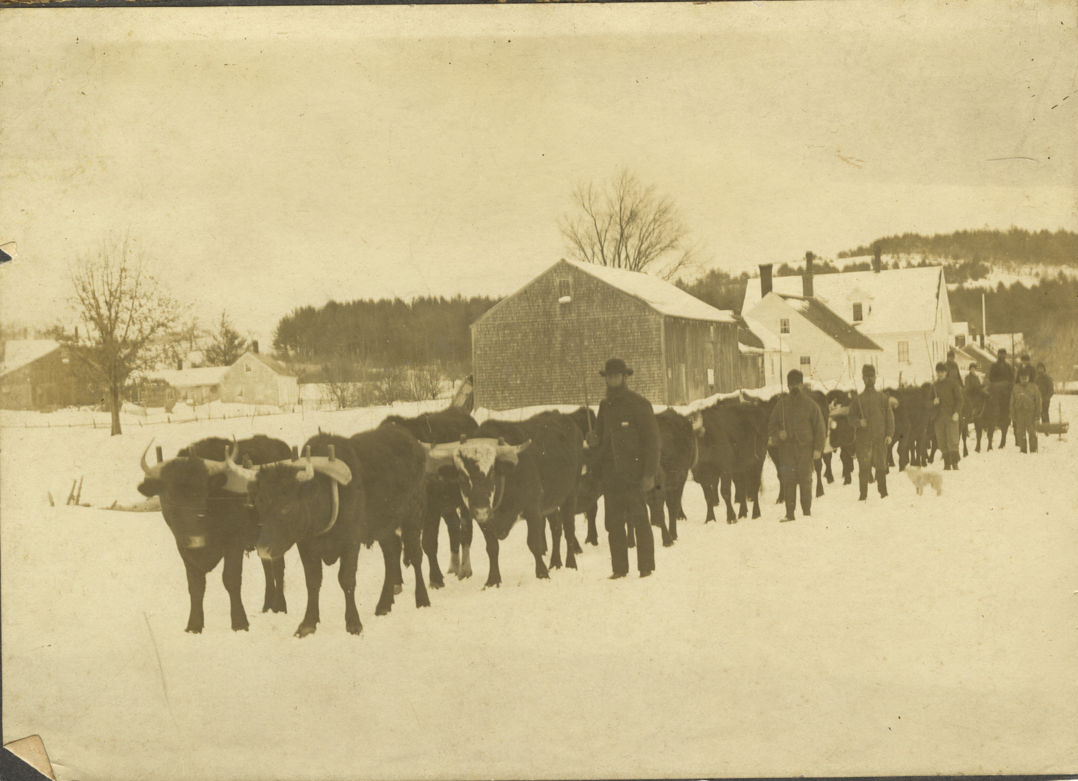 Many teams of oxen scraping the road, location unknown. C. 1900. Scrapers were not used as often and rollers.