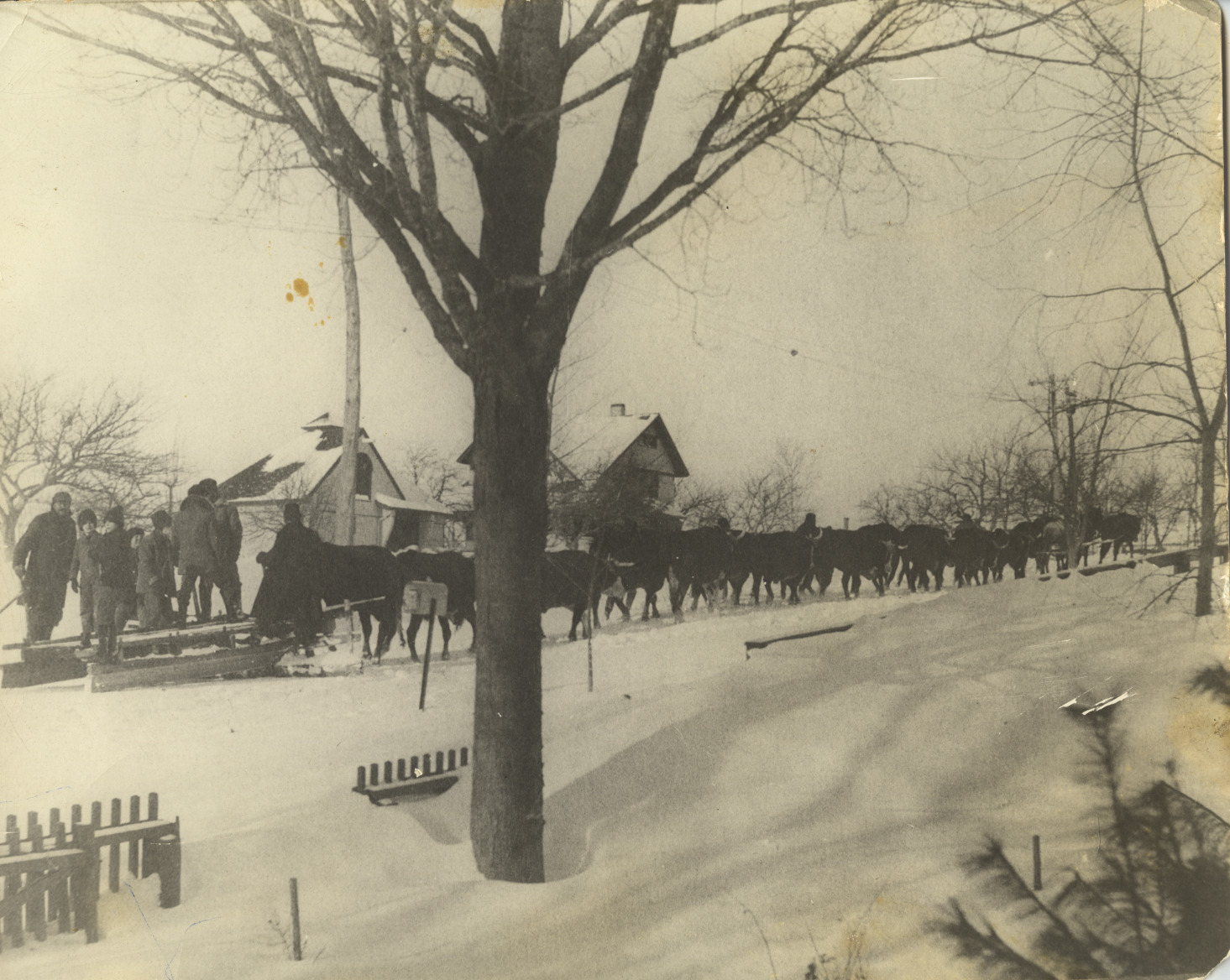 Two teams of horses and 8 teams of oxen scraping North Main Street at Lucas Street and the Jesse Gould house, c. 1900. Scrapers were not often used. The common practice was to pack the snow down with horse-drawn rollers.