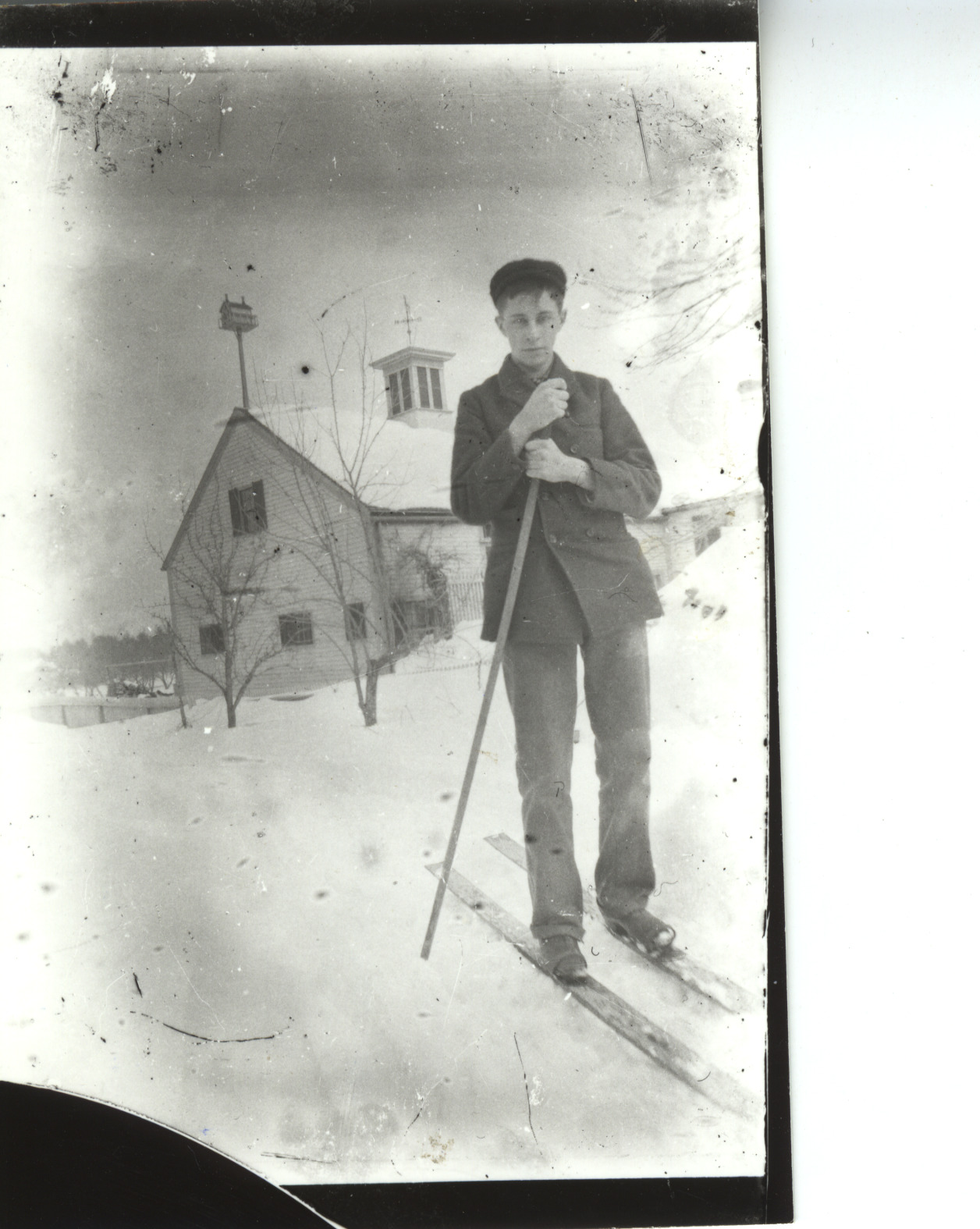 Unknown man on cross-country skis. Building in the background was the Furber Barn, later torn down. The location is now the Wolfeboro Day Care Center on South Main Street.