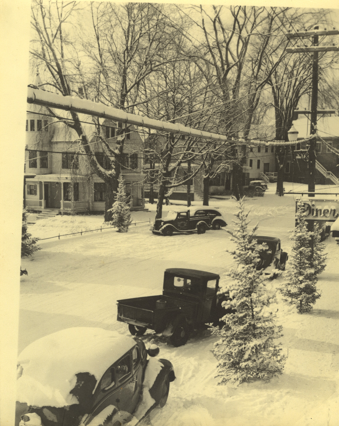 Winter on North Main St., looking northwest from bridge. Piper House on left, later relocated back toward the lake. C. 1940.
