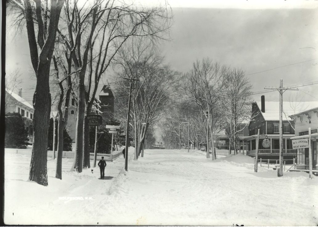 View from downtown looking up South Main St. toward Town Hall. Hobbs-Is-Inn on the right, now the site of the Post Office.