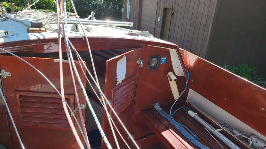 Woodwork all around is in very good condition, no rot or disintegration. Coaming has some dings and checks in the aft ends. Cockpit always covered while on mooring so brightwork looks decent.