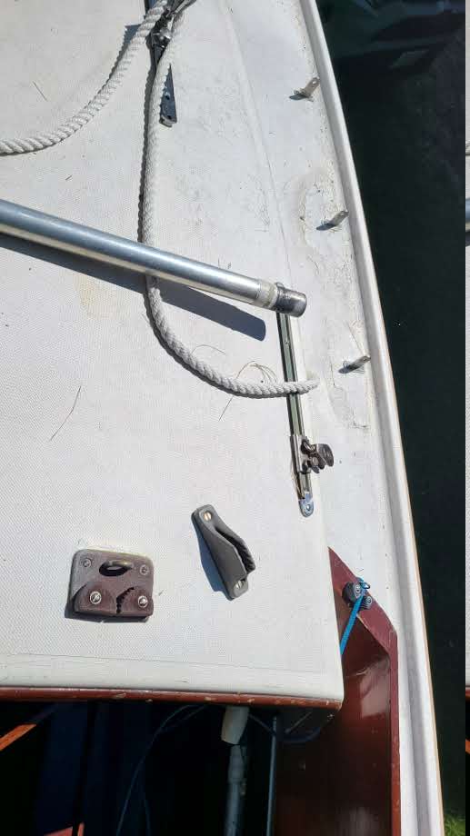Click on photo to see non-distorted photo. Two different tracks for jibs on cabin top. Note deck repair around chainplates. A little rough cosmetically, but there's no sigh of softness in deck in this area.